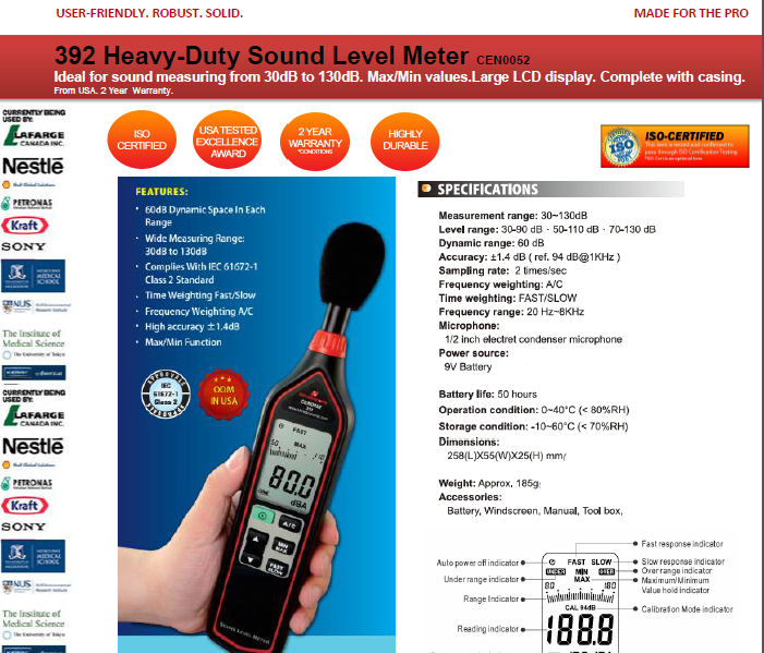 CEN0052-KKINSTRUMENTS 392 HANDHELD LARGE-DISPLAY SOUND LEVEL METER W/BARGRAPH - USA